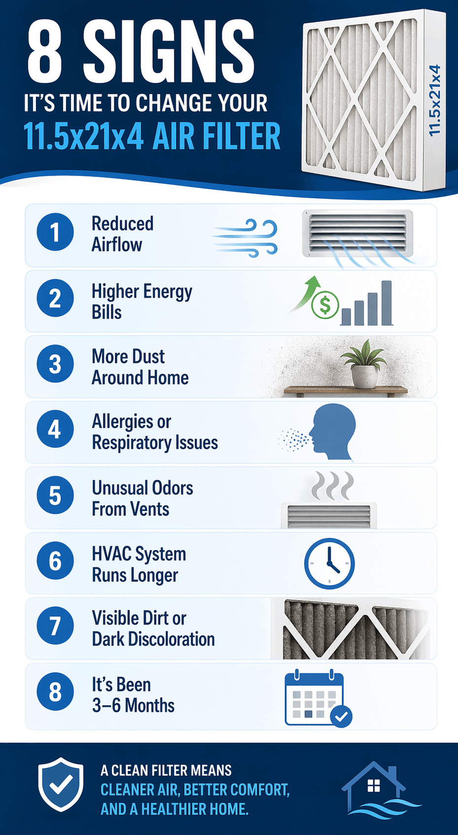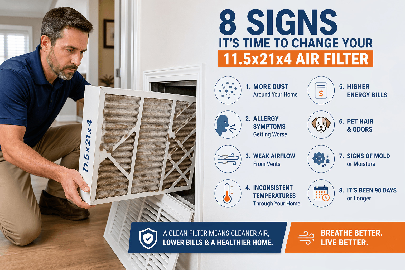 A clean 11.5x21x4 filter protects three things at once: your HVAC system, your indoor air, and your monthly power bill.